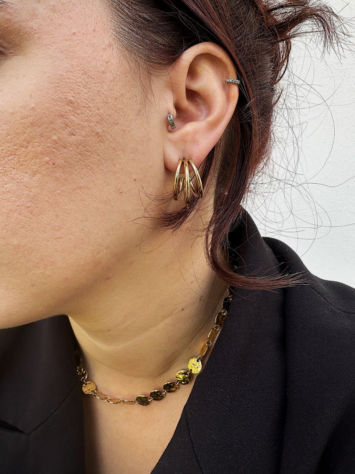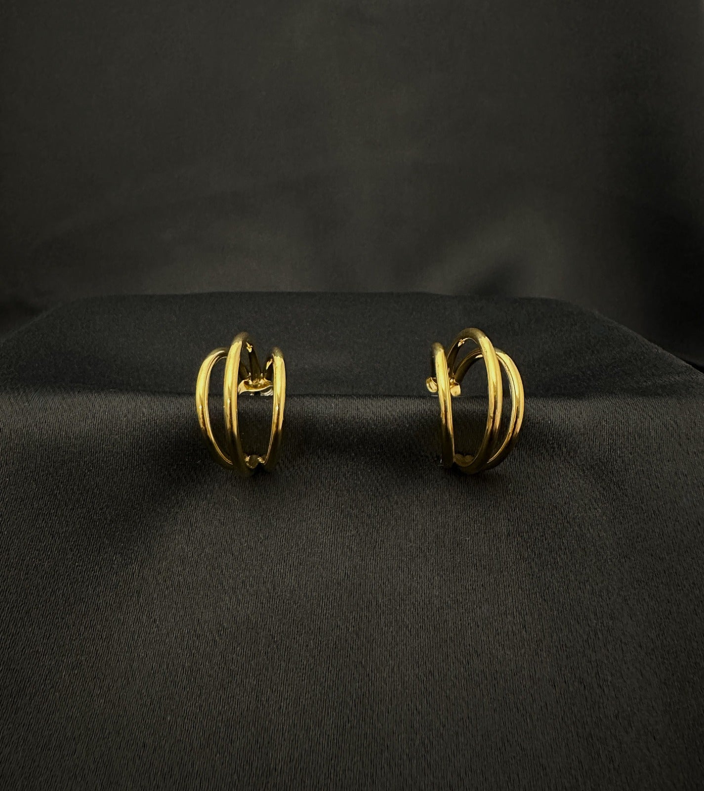 Os brincos CHICAGO. são uma ode ao design moderno — volumes entrelaçados que equilibram estrutura e movimento, num brilho dourado que capta a luz com intenção.
