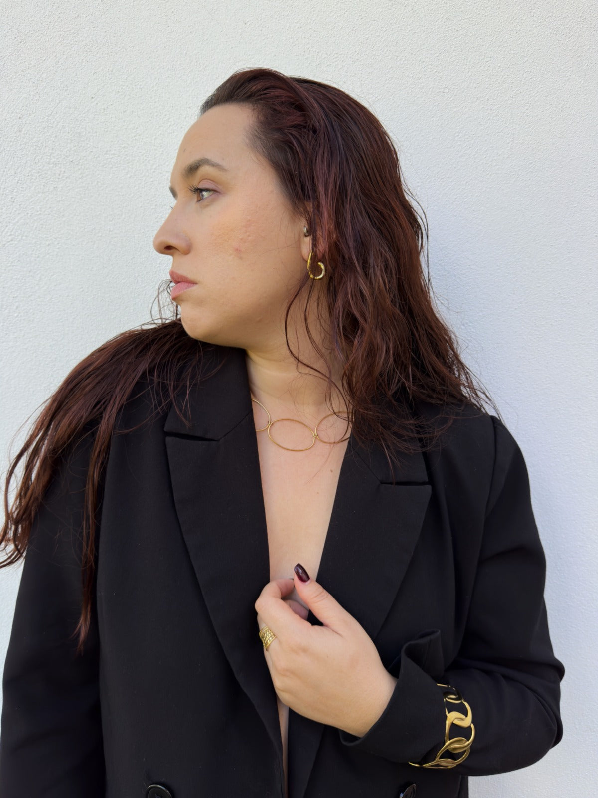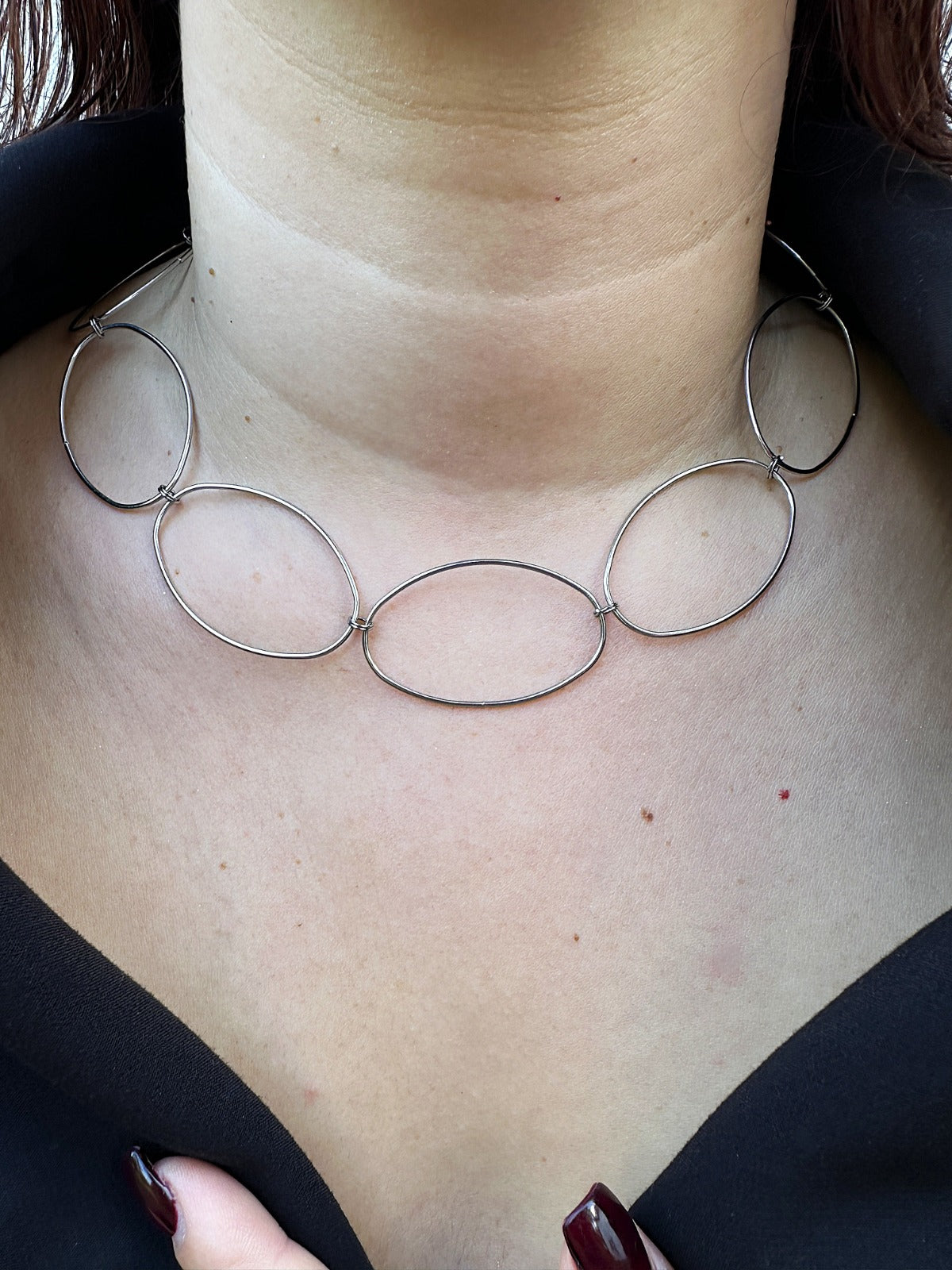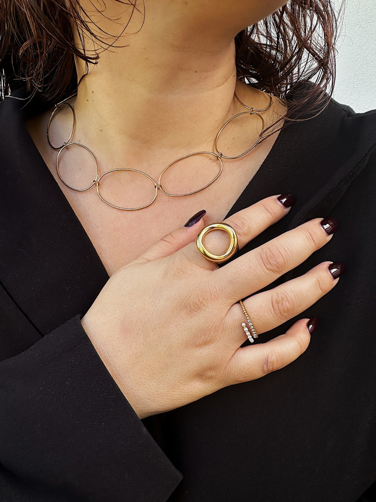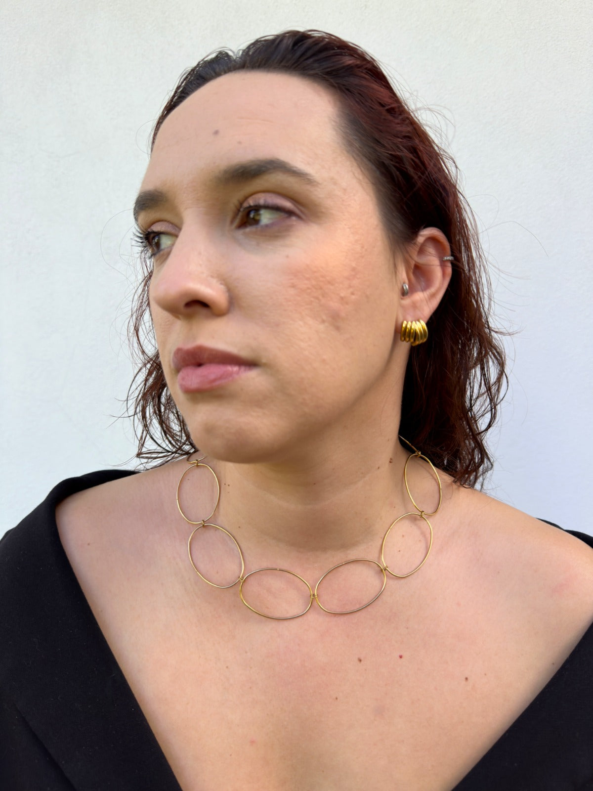 O colar MANHATTAN. traduz o equilíbrio entre estrutura e leveza — grandes elos ovais que desenham o contorno do poder feminino contemporâneo.