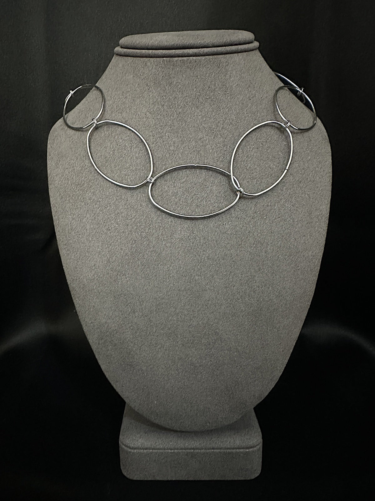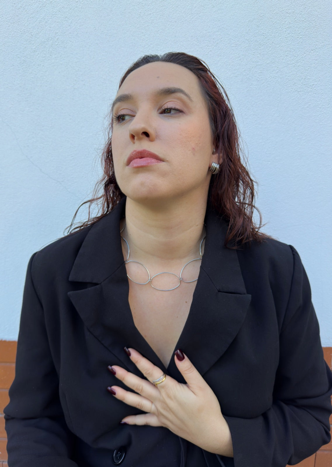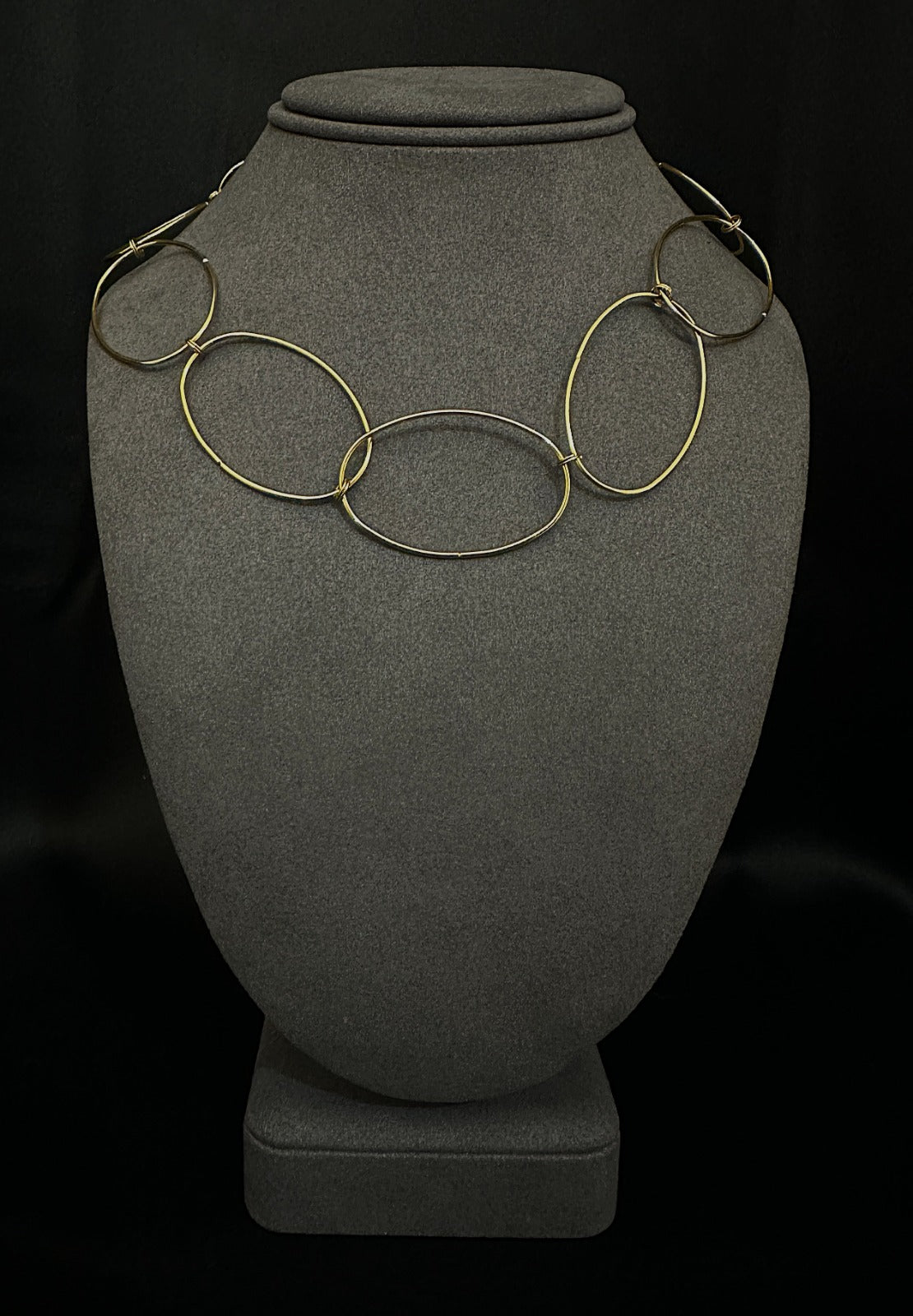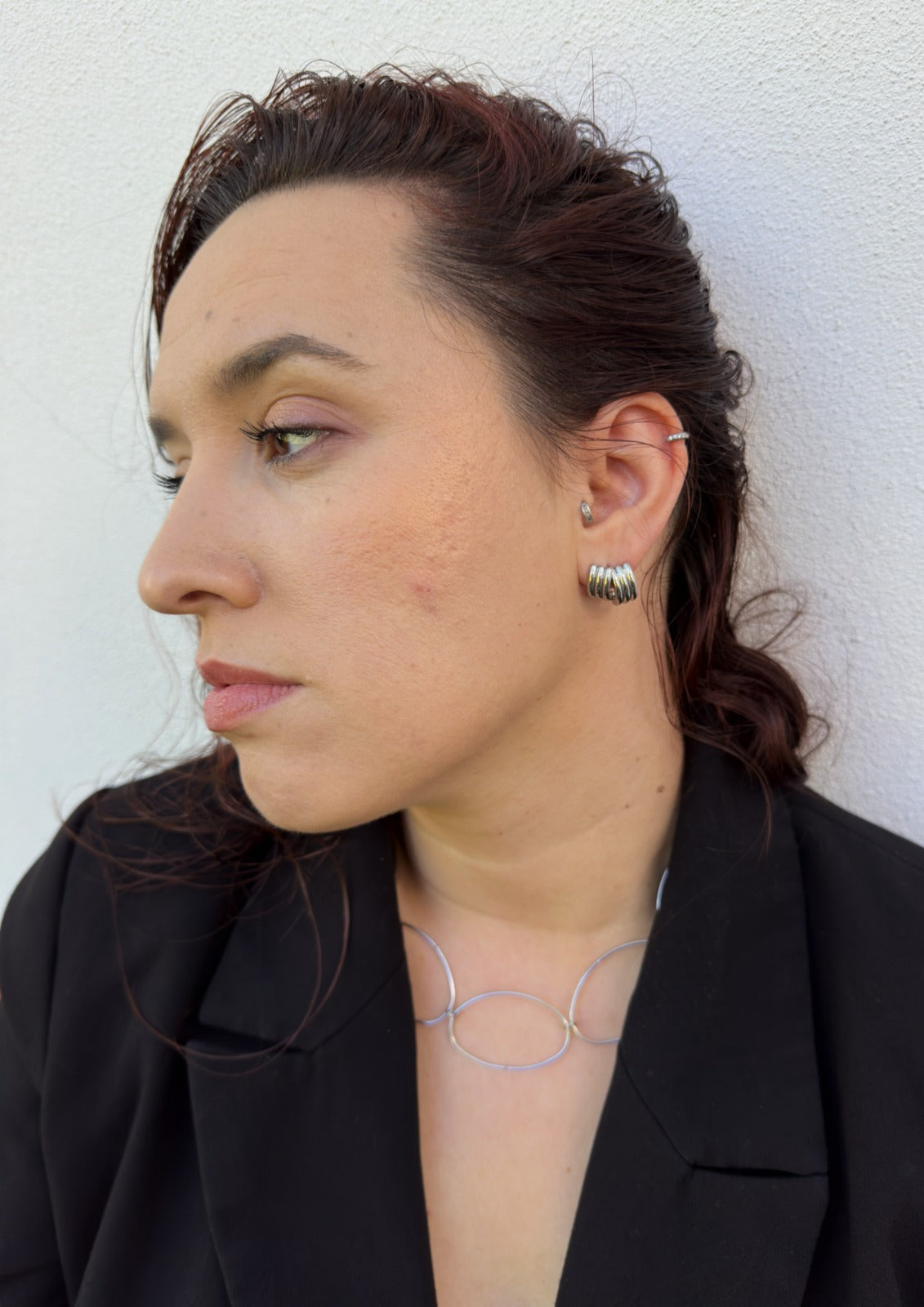 O colar MANHATTAN. traduz o equilíbrio entre estrutura e leveza — grandes elos ovais que desenham o contorno do poder feminino contemporâneo.