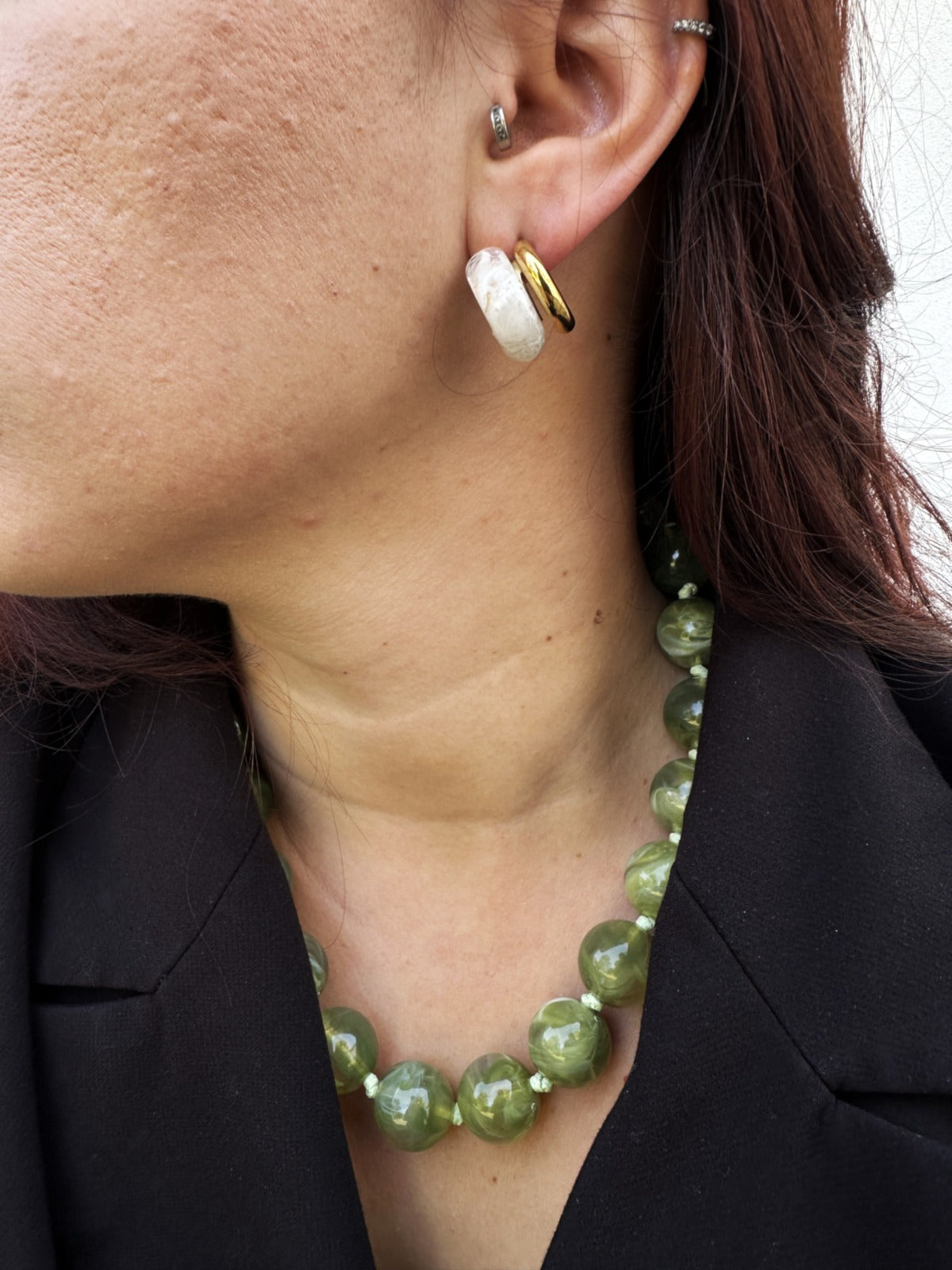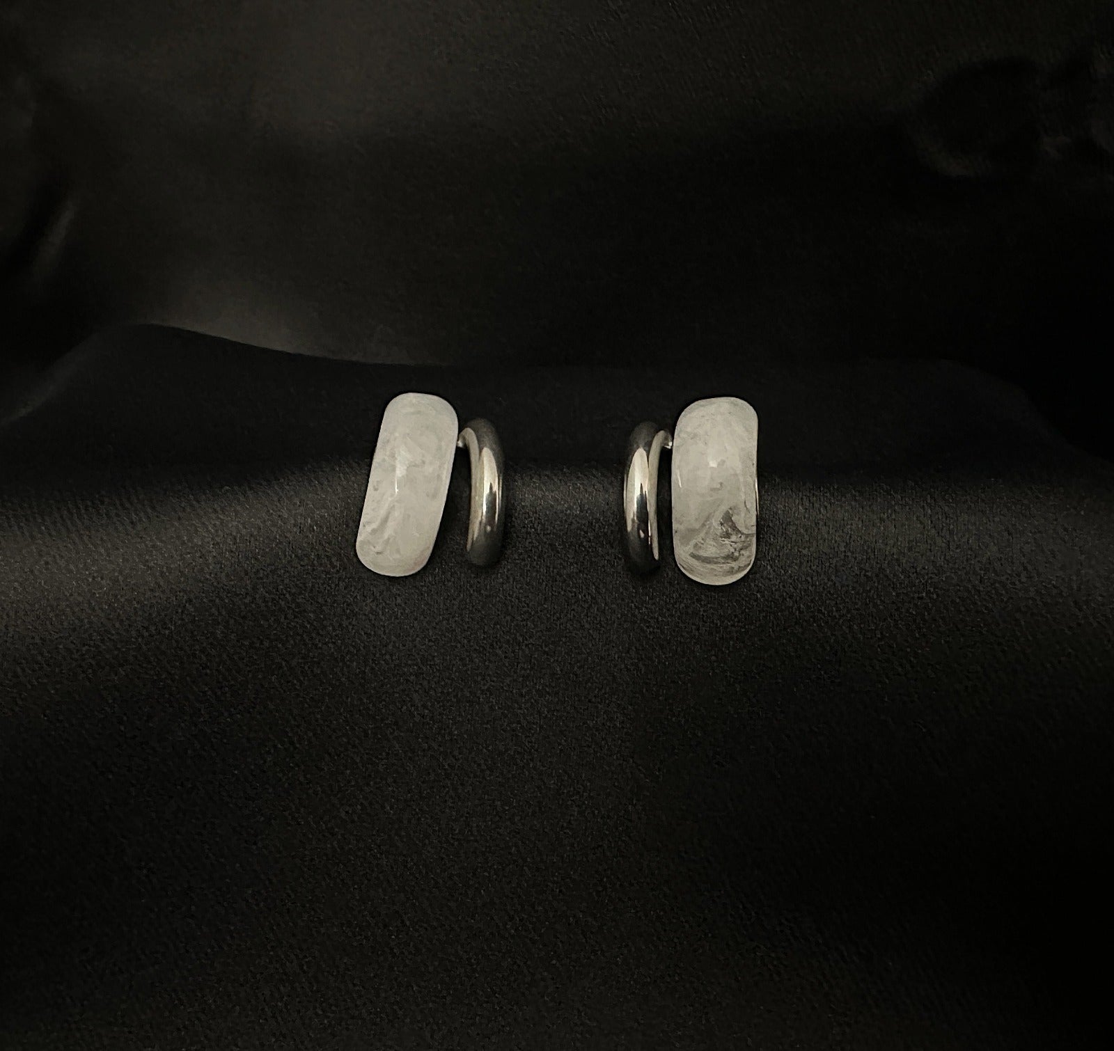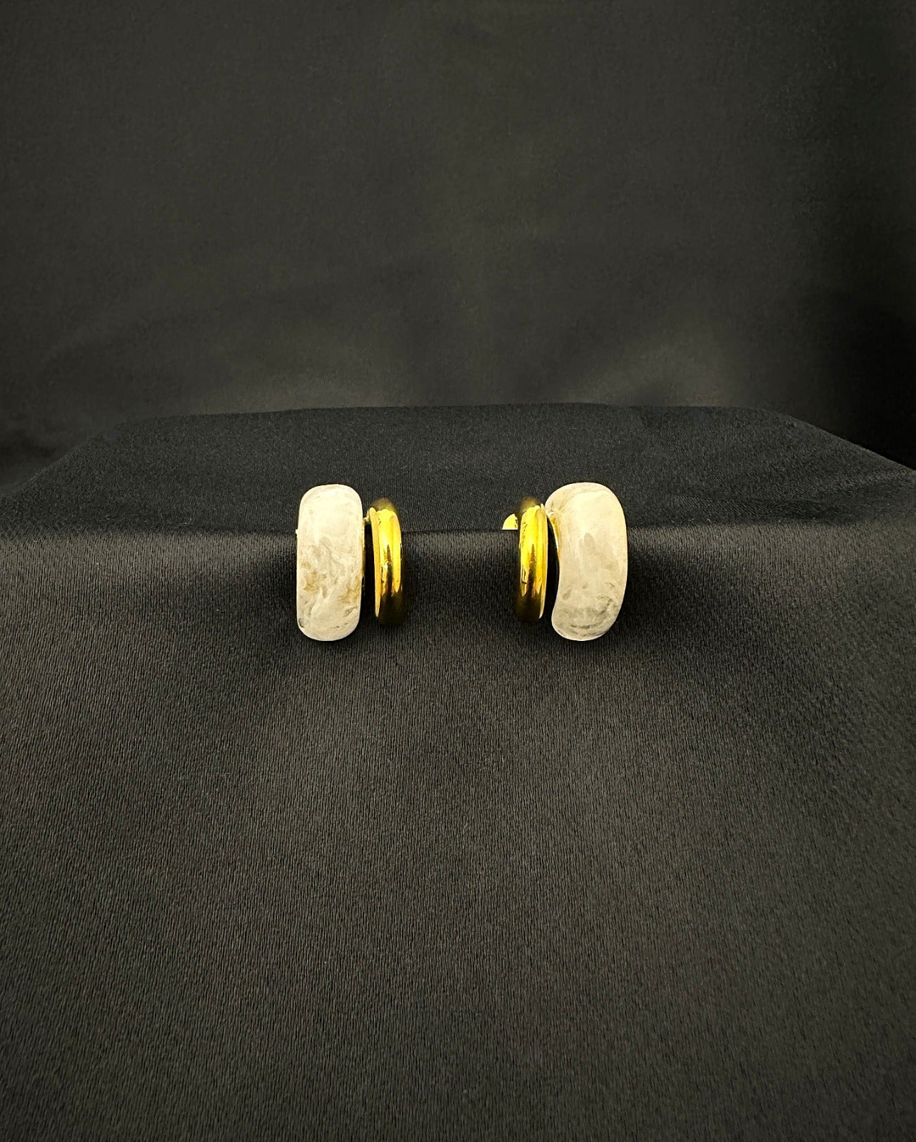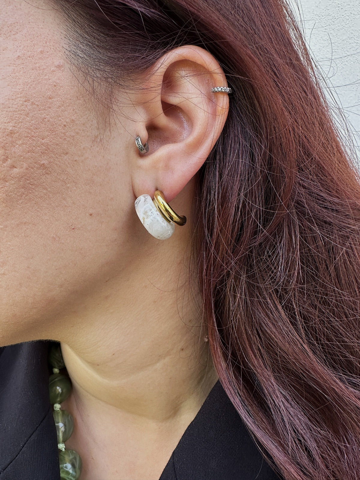 Os brincos MONTREAL. unem o dourado quente ao branco translúcido num equilíbrio entre arte e minimalismo.