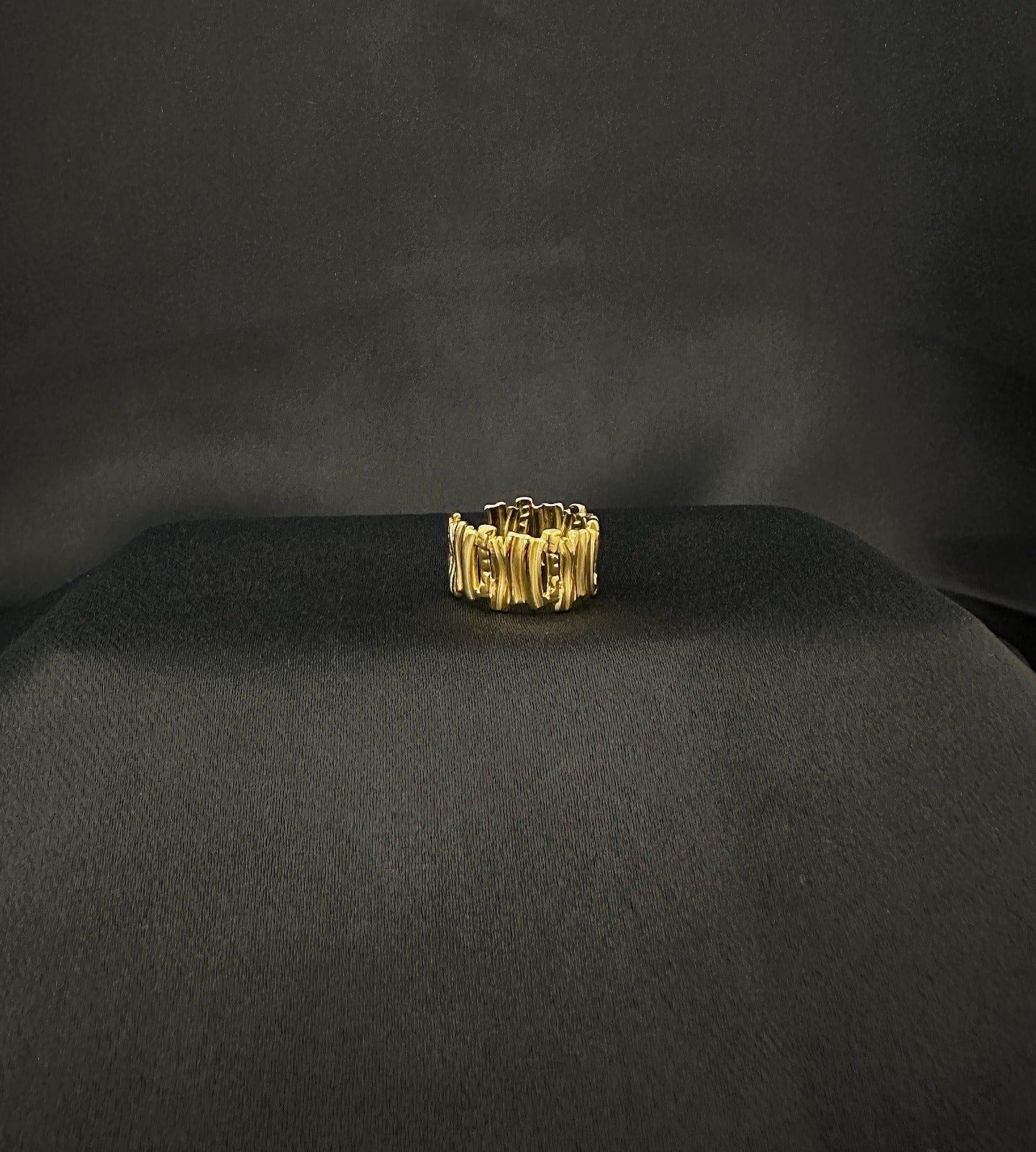 Inspirado nas curvas e contrastes de Santorini, este anel ajustável combina textura e brilho num design escultórico e contemporâneo.