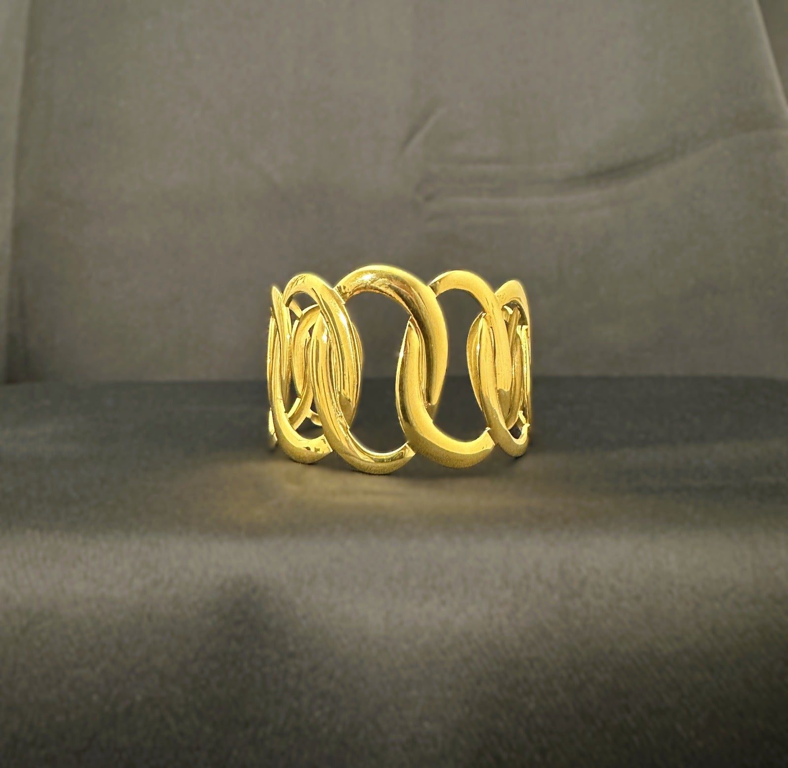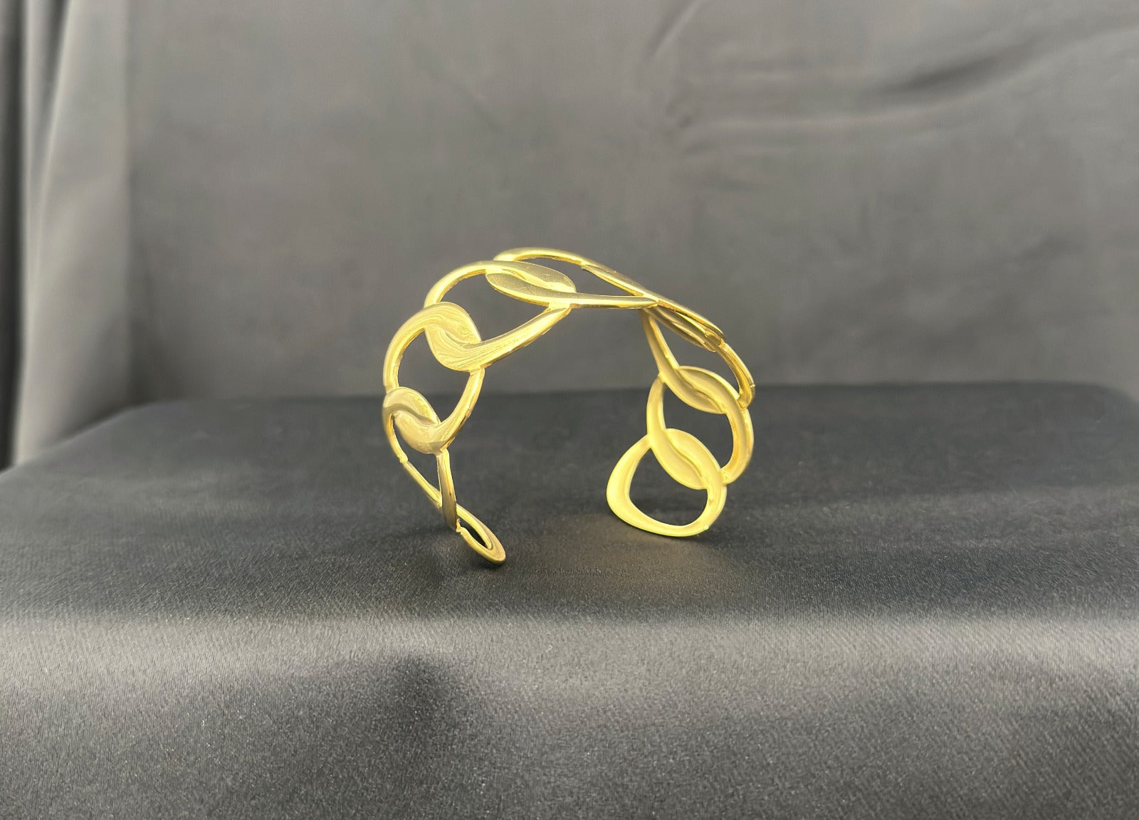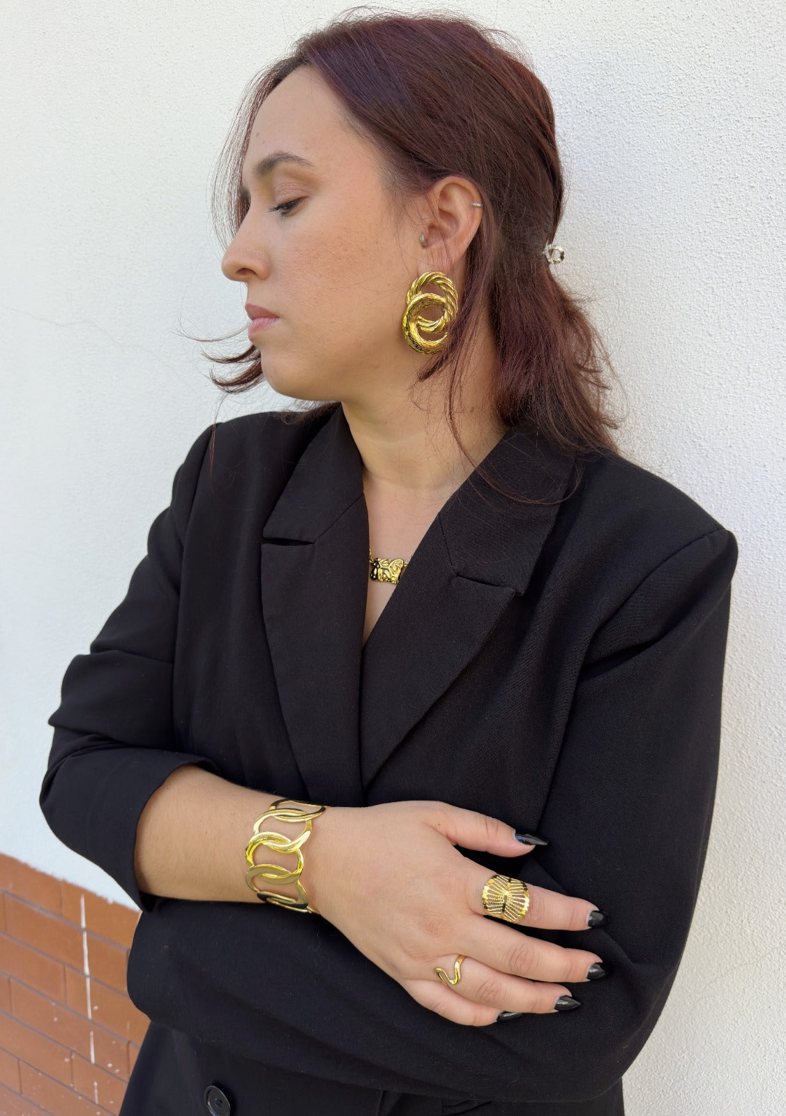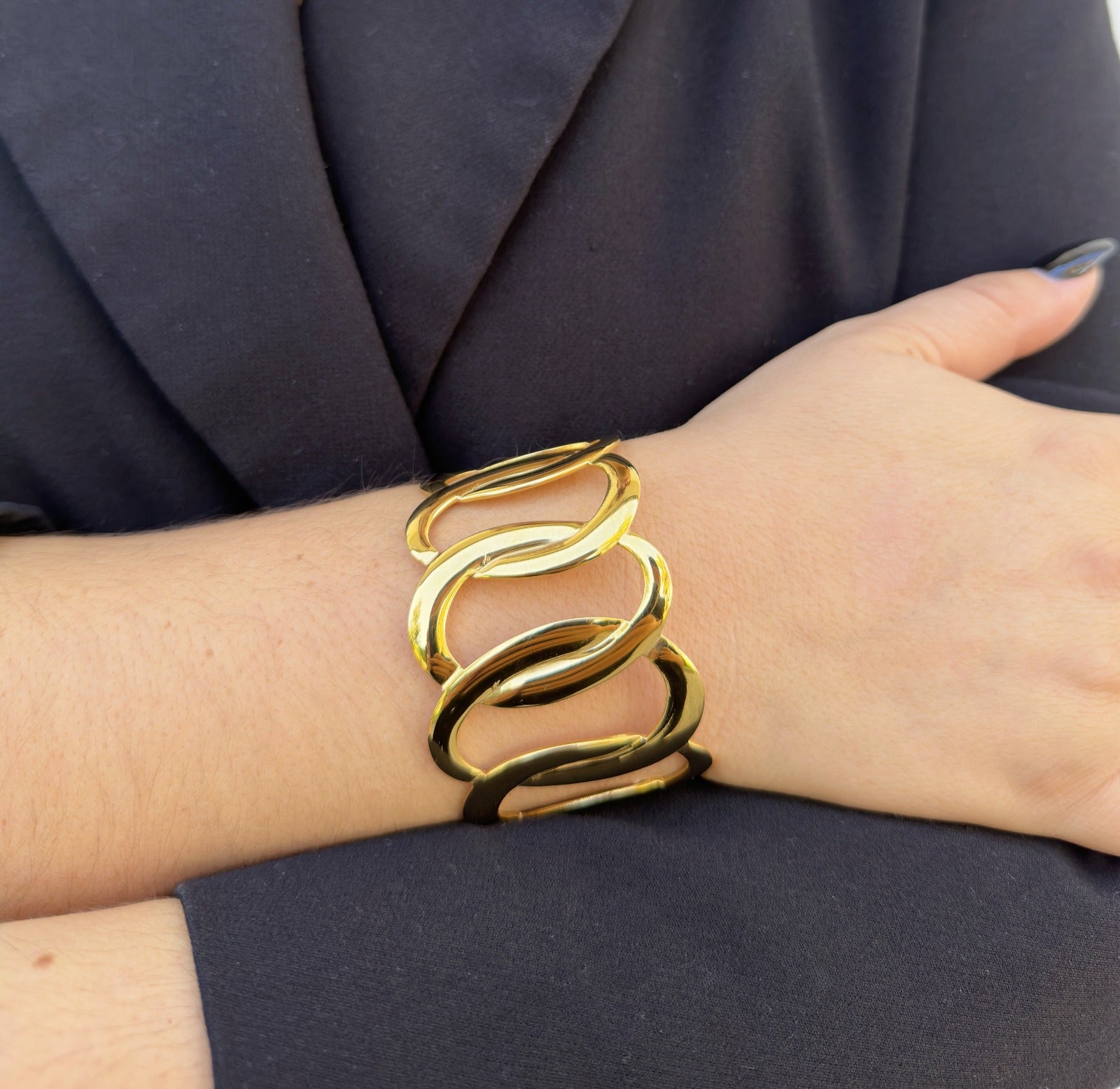 A bracelete VENEZA. é uma escultura em dourado — linhas fluidas que envolvem o pulso com elegância e atitude.
